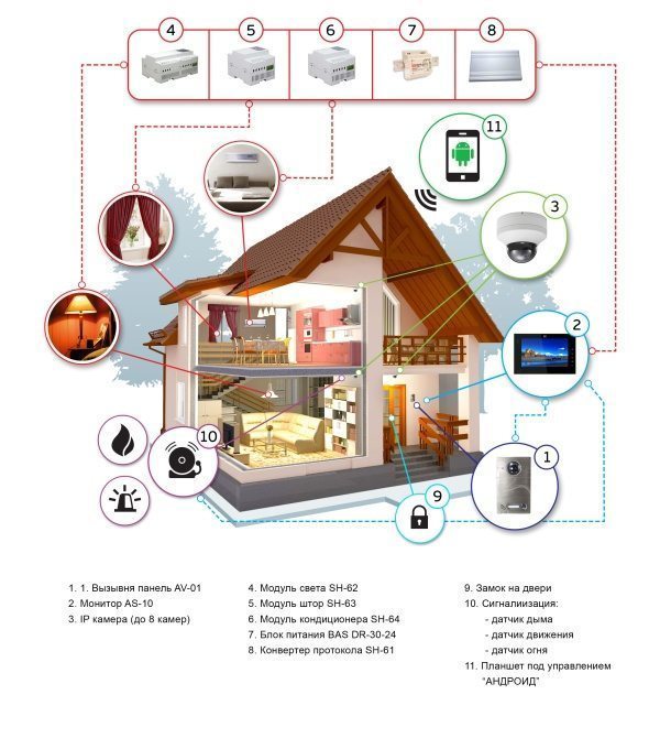 На внутреннем мониторе, выбрав раздел управления домашней автоматикой, возможно управление светом как в каждой комнате, так и раздельно несколькими лампами в одной комнате. Выбрав соответствующий экран в этом же интерфейсе, возможно управление шторами, до 4 комнат, и управление кондиционерами на холод, обогрев и вентиляцию, также в 4-х комнатах.