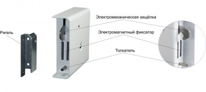 Дверной электромеханический замок представляет собой запирающий механизм, оснащенный специальным механическим ригелем, при запирании входящим в удерживающий паз. При подаче электропитания фиксатор снимается с пружины и замок отпирается. Для блокировки замка система содержит возводящий ригель или соленоид.