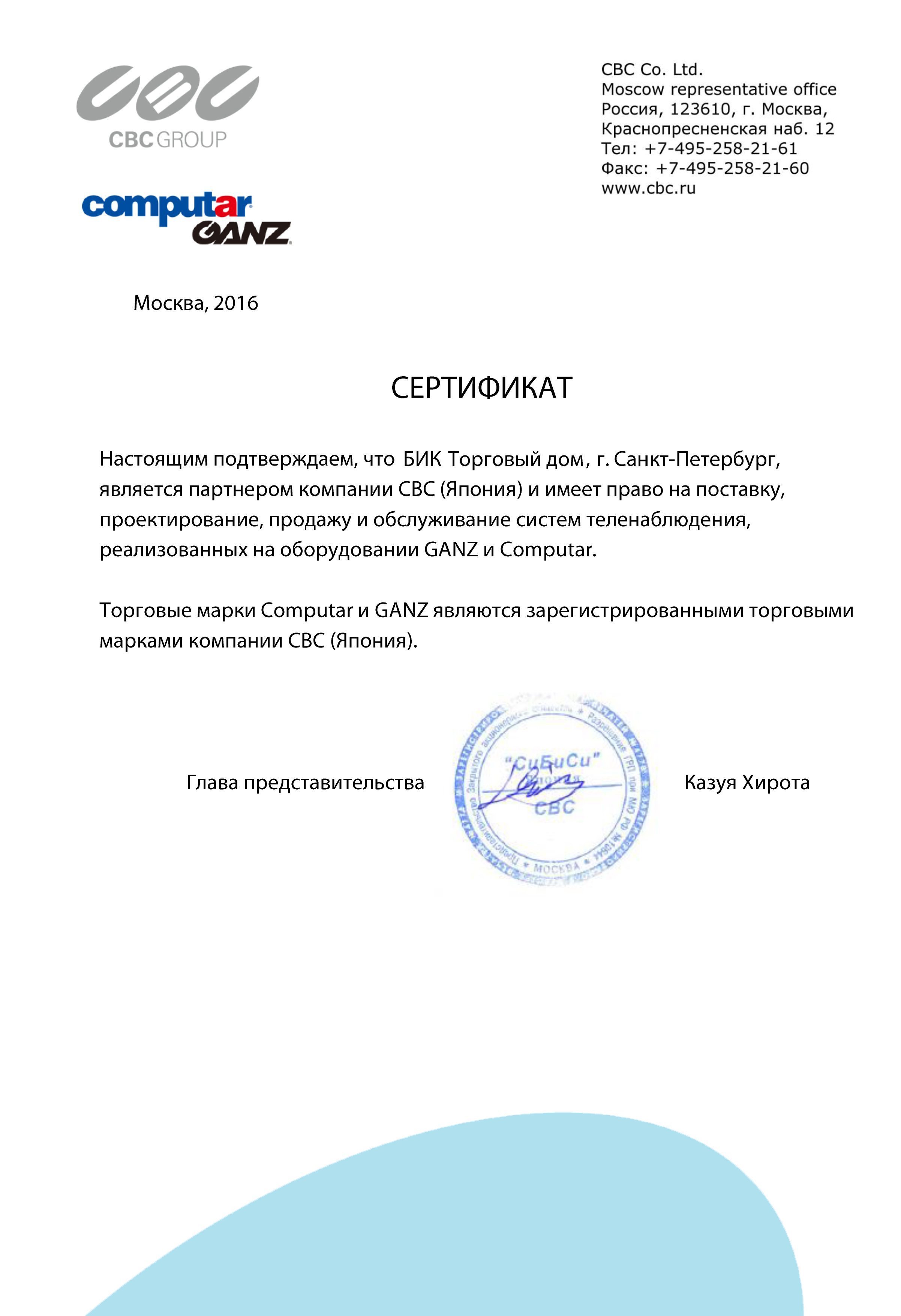 12 Computar Сертификат партнера СиБиСи БИК Тороговый дом
