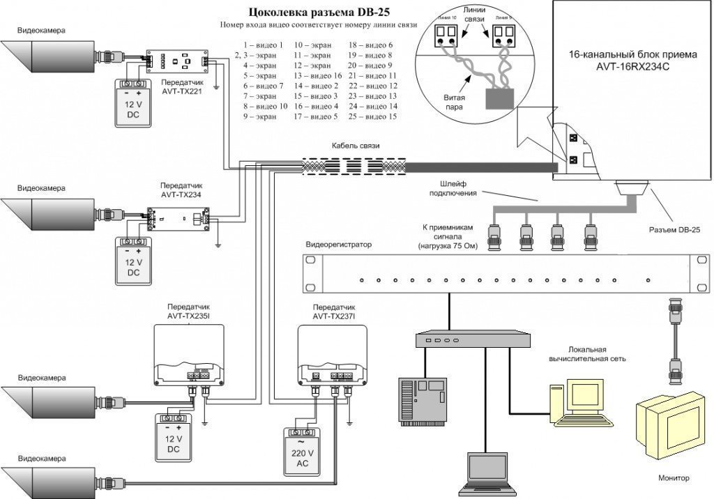 Активный 16-канальный блок приема видеосигнала AVT-16RX234C с дополнительной защитой каждого канала работает с кабелем "витая пара" типа ТПП. Передача видеосигнала с разрешением 600 ТВЛ на расстоянии до 1500 метров с активными передатчиками, до 1000 м с пассивными передатчиками. Металлический корпус с блоком питания.