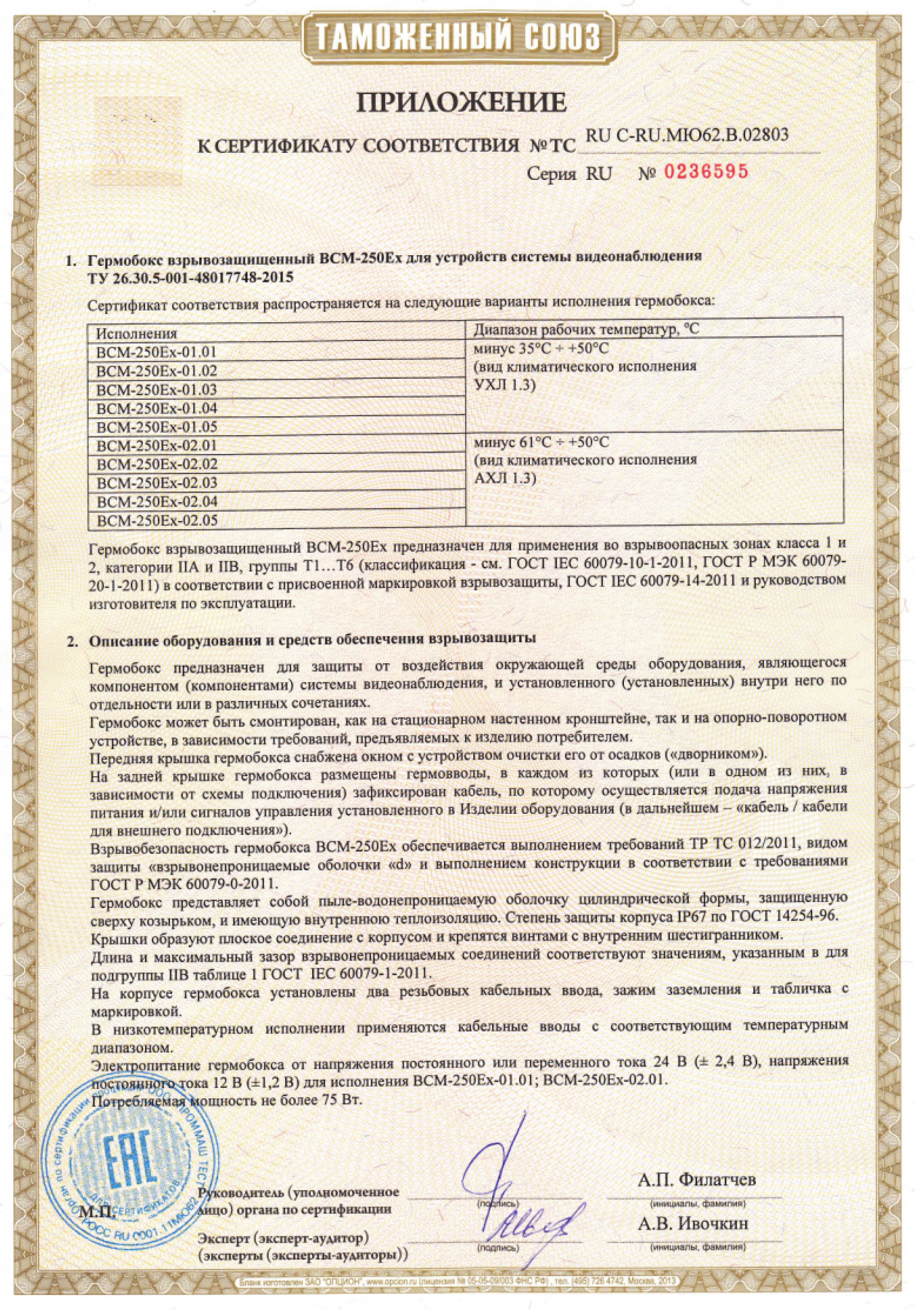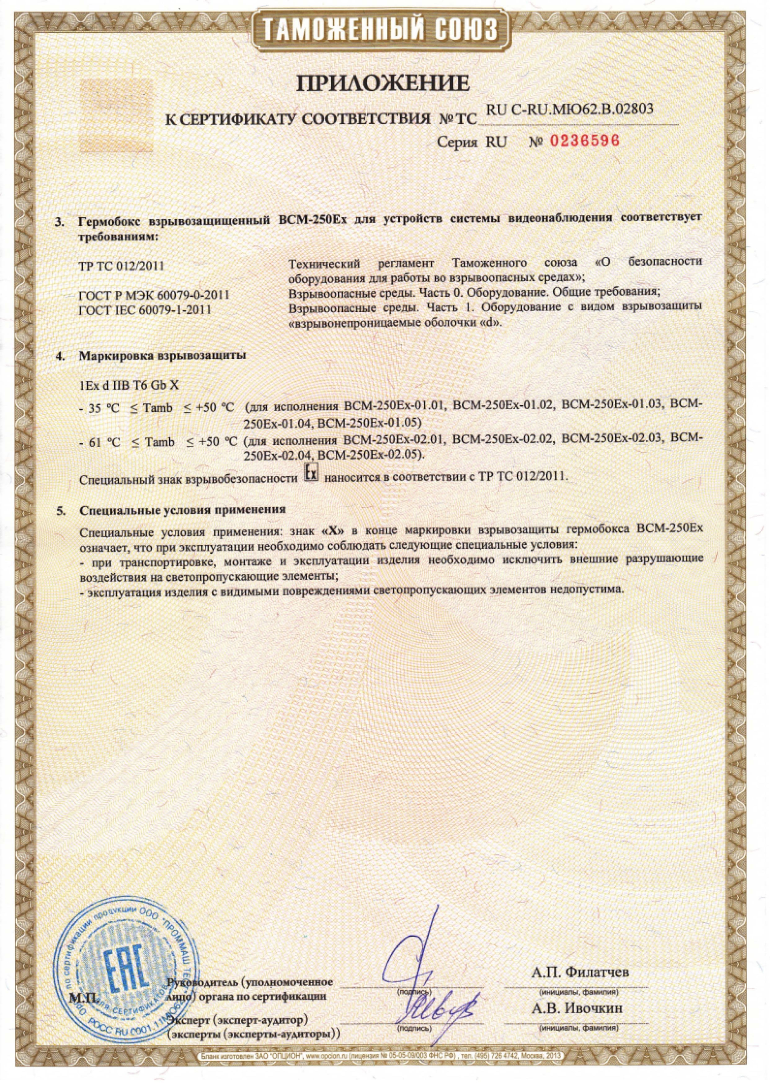 Гермобокс взрывозащищенный BCM-250Ex-02.01 для устройств системы видеонаблюдения - предназначен для защиты от воздействия окружающей среды оборудования, являющегося компонентом (компонентами) системы видеонаблюдения и установленного (установленных) внутри него по отдельности или в различных сочетаниях. Универсальный крепеж позволяет произвести монтаж бокса как на стационарном настенном кронштейне, так и на опорно-поворотном устройстве. Передняя крышка снабжена окном с устройством очистки от осадков. Предназначен для применения во взрывоопасных зонах класса 1 и 2, категории и II A и II B групп Т1-Т6 с маркировкой взрывозащиты 1Exd IIBT6GbX. Степень защиты корпуса IP67. Полезный объем 140 х 52 х 60 мм.