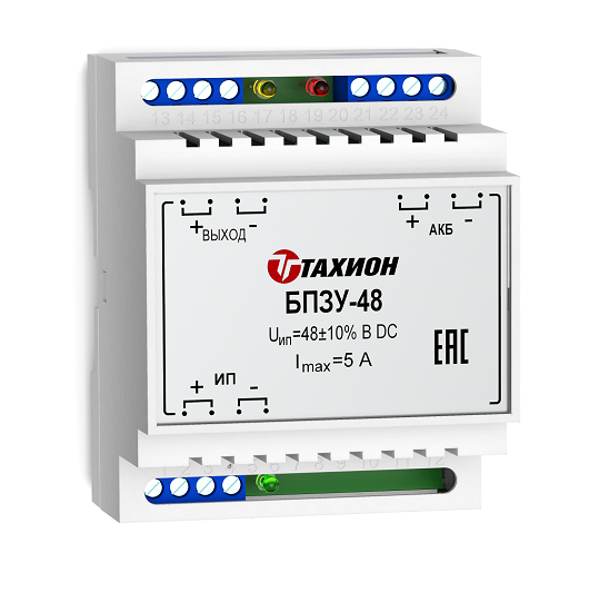 БПЗУ-48 - блок переключения питания с зарядным устройством. Предназначен для создания системы бесперебойного питания с использованием внешнего источника питания 48 В и четырех подключенных последовательно 12 В аккумуляторных батарей (АКБ). Максимальный выходной ток 8А. Емкость АКБ не более 9 A/ч.