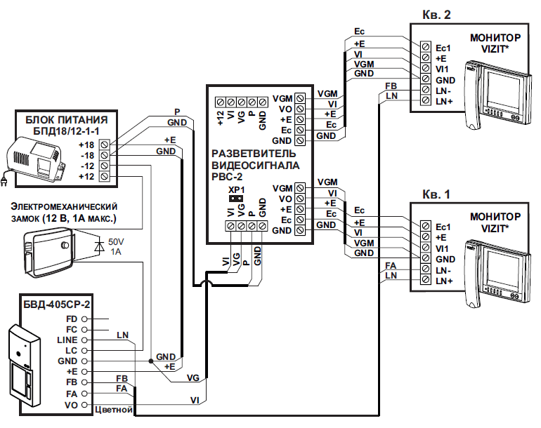 БВД-405СP-2 - с телекамерой цветного изображения, предназначен для подключения двух мониторов;