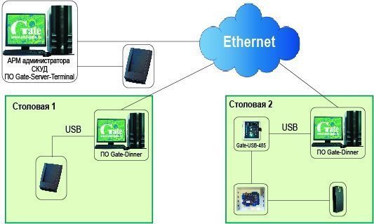 Настройка всей системы и программного модуля Сервера учета обедов Gate-Dinner осуществляется через интерфейс штатного ПО Gate-Terminal на АРМ администратора системы. В программе создается перечень расписаний обедов — временных интервалов, в течение которых производится обслуживание в каждой столовой. Для каждого сотрудника задаются разрешенные расписания обедов, т.е. интервалы, когда данный сотрудник может обслуживаться в столовой. При этом в течение одного интервала каждый сотрудник может быть обслужен не более одного раза. В качестве идентификаторов в СКУО могут использоваться штатные идентификаторы системы доступа предприятия, специально выделенные идентификаторы, а также различные типы биометрической идентификации.