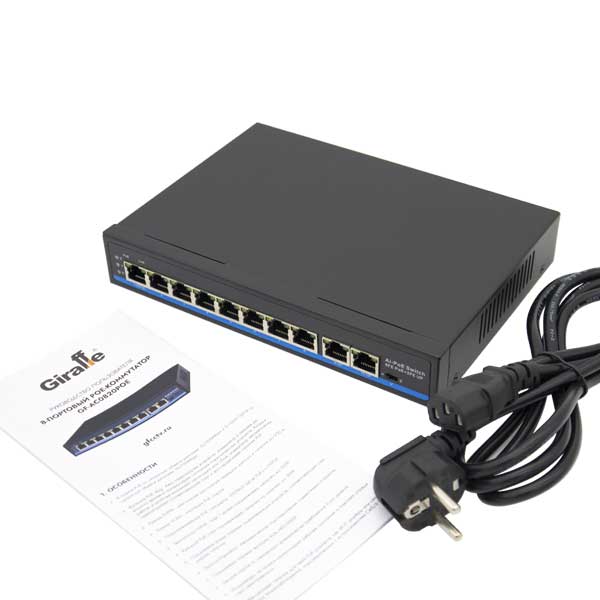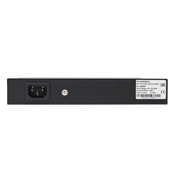 Сетевой коммутатор GF-AC0820PoE служит для передачи данных и питания. Устройство имеет 10 портов. Из них: 8 портов с поддержкой PoE и 2 порта UPLINK - 10/100Мб/с . Устройство поддерживает такие стандарты, как IEEE802.3 af/at, IEEE 802.3, IEEE 802.3i 10BASE-T, IEEE 802.3u 100BASE-TX, IEEE 802.3x, IEEE 802.1q. На каждый PoE канал приходится до 30 Вт. Общая мощность до 120 Вт. Функция автоматической перезагрузки устройств. Режим VLAN - изоляции РоЕ портов. Режим SUPM - увеличение расстояния передачи до 250м. Встроенный блок питания AC 100-240V.