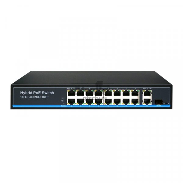 Сетевой коммутатор GF-AC1621PoE служит для передачи данных и питания. Устройство имеет 19 портов. Из них:16 портов с поддержкой PoE- 10/100Мб/с., 2 порта UPLINK - 10/100/1000Мб/с и 1 порт SPF - 1000Мб/с. Устройство поддерживает такие протоколы и стандарты, как IEEE802.3; IEEE802.3i 10BASE-T; IEEE802.3u 100BASE-TX; IEEE 802.3ab 1000BASE-T; IEEE802.3x; IEEE802.3af/at//PoE++; HiPoE. На каждый PoE канал приходится до 30 Вт. Общая мощность до 300 Вт. Функция автоматической перезагрузки устройств. Режим VLAN - изоляции РоЕ портов. Режим SUPM - увеличение расстояния передачи до 250м. Встроенный блок питания AC 100-240V.