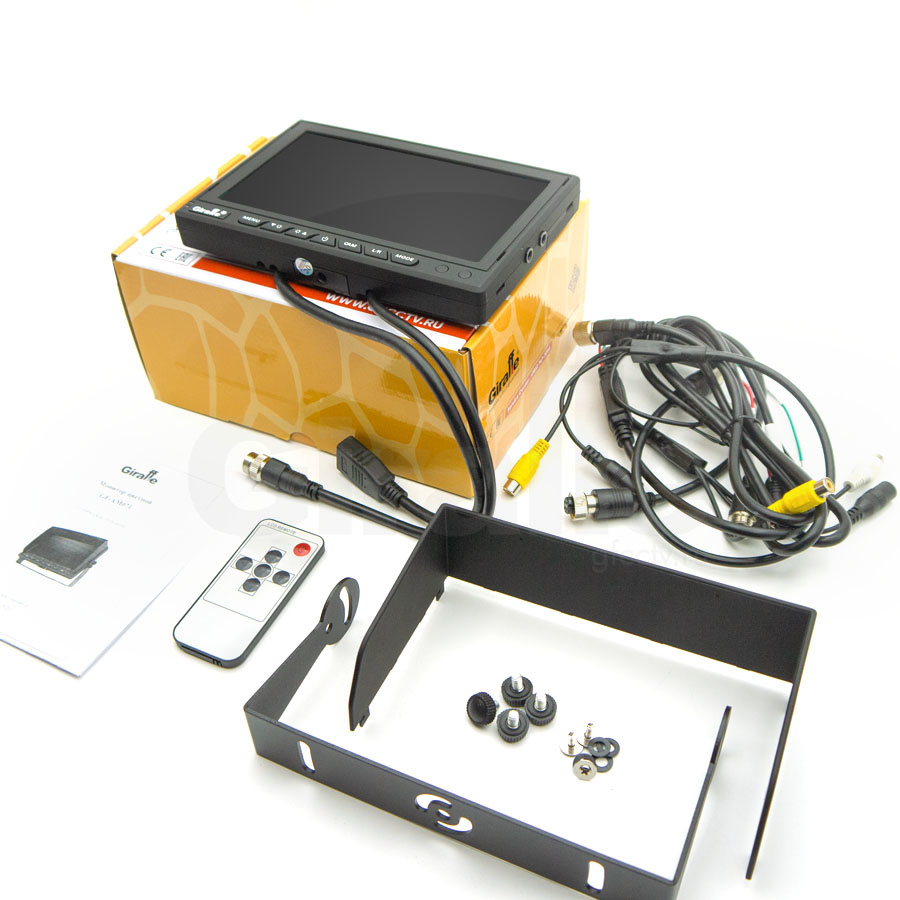 Монитор укомплектован пультом дистанционного управления, поворотным кронштейном-опорой для крепления, солнцезащитным козырьком и соединительным кабелем для питания и подключения источников видео сигнала.