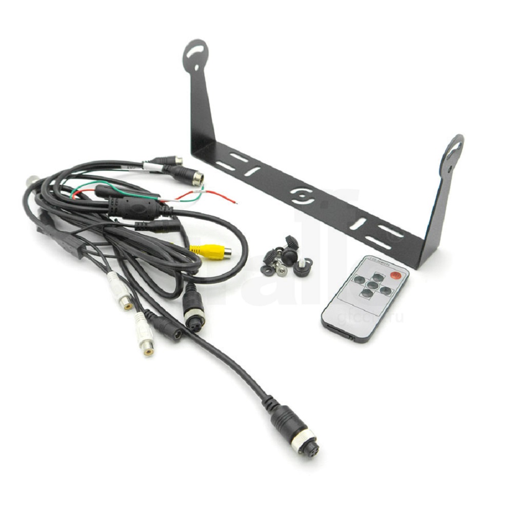 Монитор укомплектован пультом дистанционного управления, поворотным кронштейном-опорой для крепления, солнцезащитным козырьком и соединительным кабелем для питания и подключения источников видео сигнала.