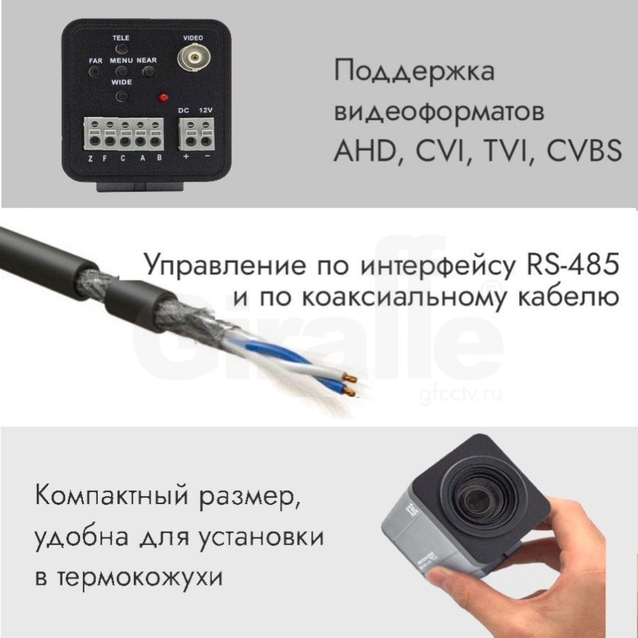 Корпусная HD видеокамера GF-CZ20HD2.0 имеет 20-кратный Моторизованный объектив с фокусным расстоянием 4.7-94 мм, поддерживает функцию «Автофокус». Управление объективом камеры может осуществляться по интерфейсу RS-485 или по коаксиальному кабелю.