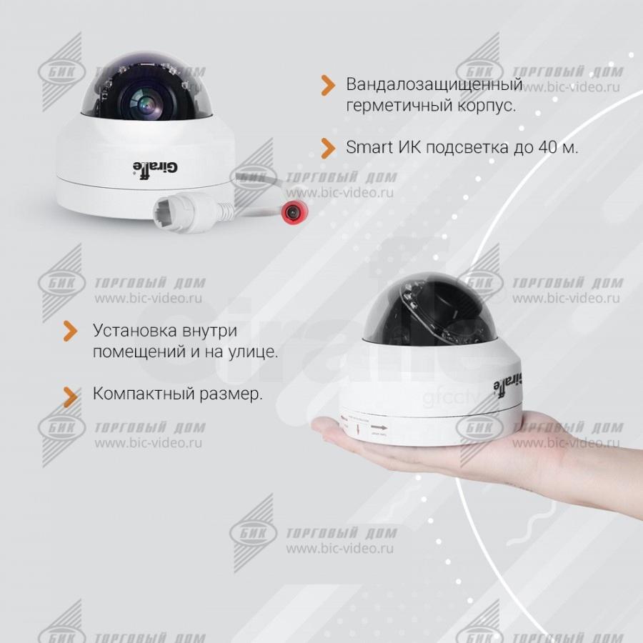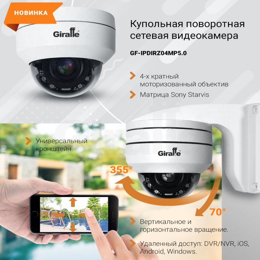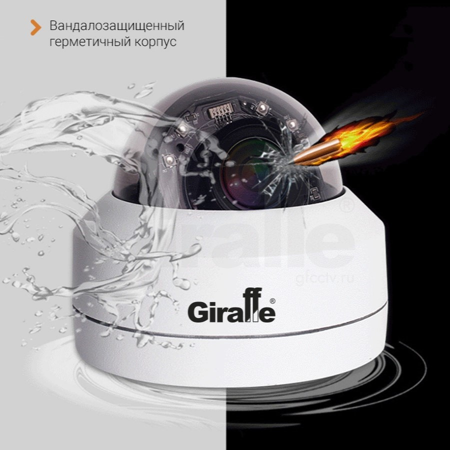Поворотная IP видеокамера GF-IPDIRZ04MP5.0 выполнена в металлическом корпусе с классом защиты IP66.