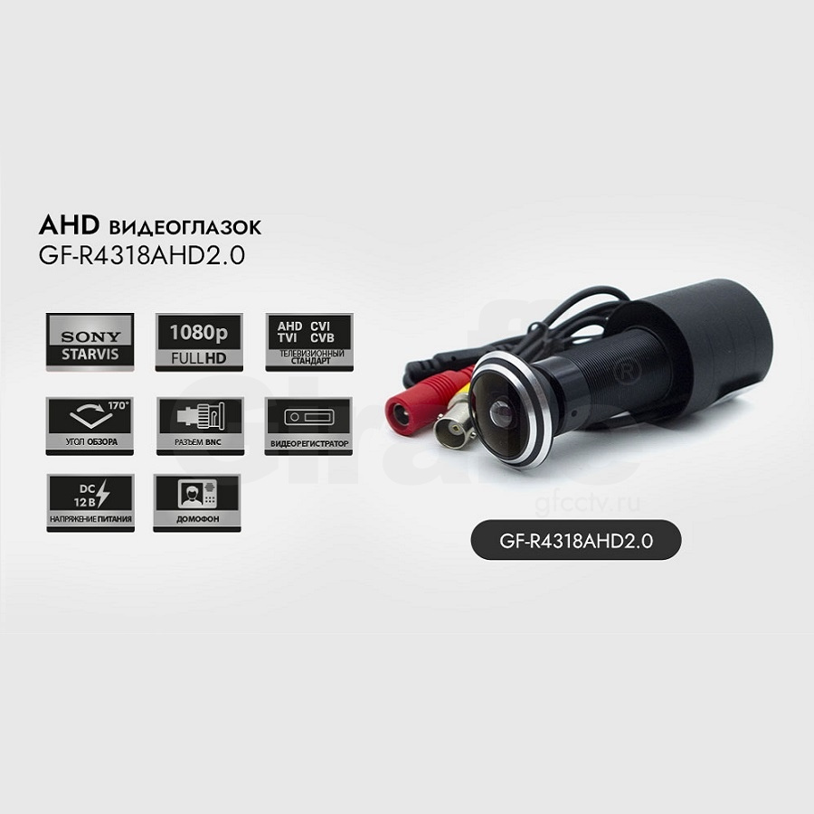 Миниатюрная аналоговая HD видеокамера GF-R4318AHD2.0 выполнена в корпусе типа "видеоглазок" и предназначена для установки в дверь. Конструктивно она состоит из стеклянной ударопрочной линзы в металлическом ободе и металлического цилиндрического корпуса.