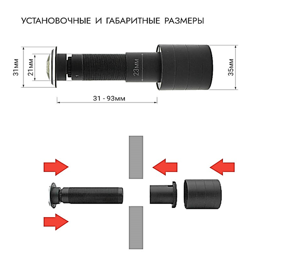 Корпус видеокамеры регулируется по длине. Поэтому она может быть настроена для установки в двери, толщина полотна которых находится в диапазоне от 31 мм до 90 мм. Диаметр отверстия 21-30 мм.