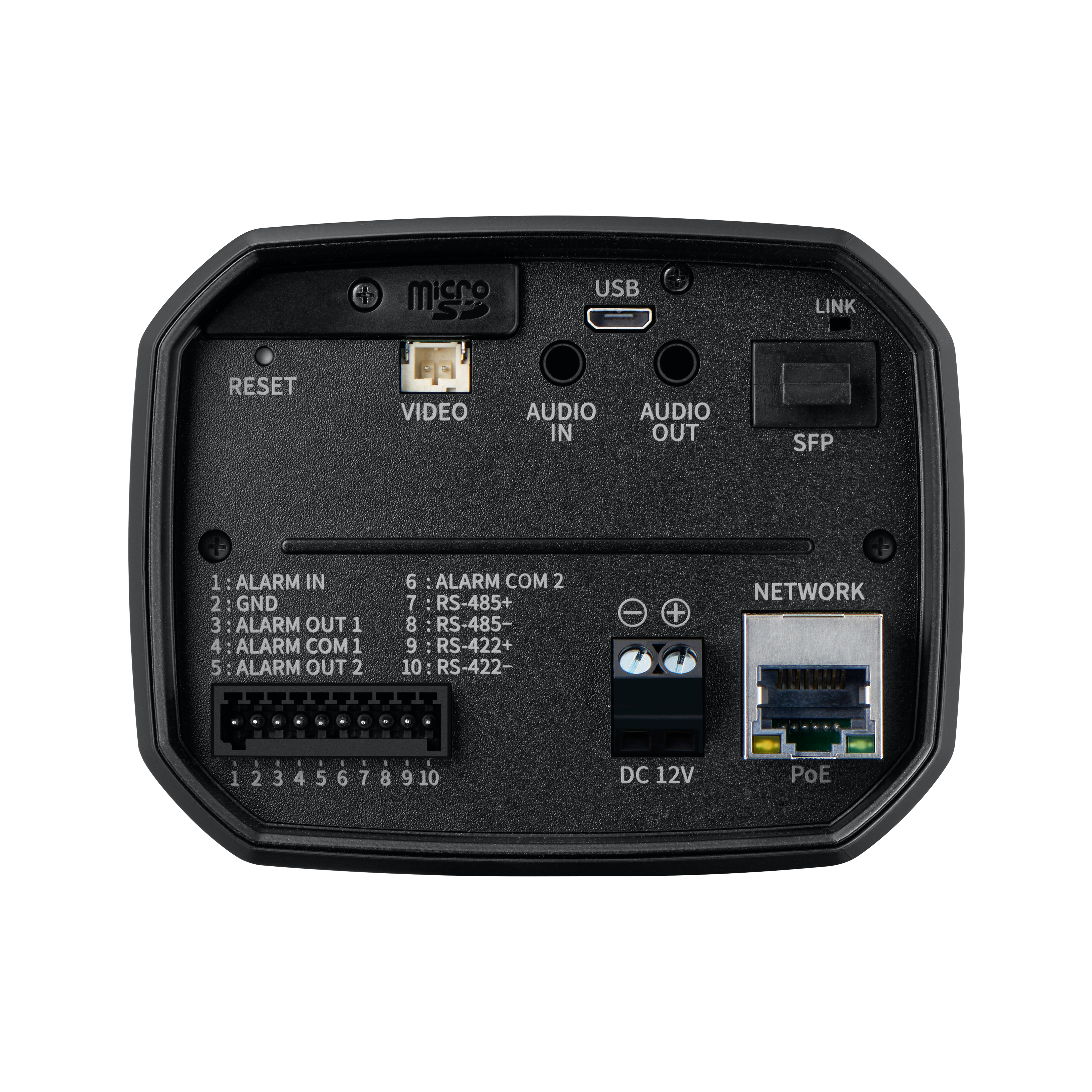 IP-камера корпусная с встроенным трансфокатором 4.44 ~ 142.6 (32х); матрица 1/2.8" 2M CMOS; разрешение 1920 x 1080, 60 кадр/сек. (H.265/H.264), 30 кадр/сек (MJPEG); поддержка WiseStream II; чувствительность 0,05/0.005лк. (F1.6, 1/30сек.); доп. аналоговый видео выход CVBS : 1.0 V / 75Ω; доп. MicroUSB выход тип В, 1280х720: апертура F1.6 (Wide) / F4.4 (Tele), углы обзора Гор: 64.66˚(Wide) ~ 2.29˚(Tele) / Верт: 38.08˚(Wide) ~ 1.30˚(Tele); механический ИК-фильтр День/Ночь; компенсация встречной засветки (BLC/HLC), аппаратный динамический диапазон (WDR) 120dB; улучшение контраста (SSDR); цифровое шумоподавление SSNR5; цифровая стабилизация изображения; антитуман (Defog); детектор движения 8 зон (8-ми точечный), передача сигнала управления на поворотную IP камеру (Handover); маскирование - 32 зоны; встроенная видеоаналитика (праздношатание, направление движения, детекция задымления/тумана, виртуальная линия, детектор лица, детектор оставленных/похищенных предметов, вход/выход из зоны, детектор внешнего воздействия, детектор звука); аудиоаналитика (выстрел, разбитие стекла, взрыв, громкий крик); сетевые разъемы: RJ-45 (10/100 Base-T), SFP (100BASE-FX); аудио: 1вх./ 1 вых.; сжатие звука G.711 u-law / G.726, G.726 (ADPCM) 8KHz, G.711 8KHz, G.726 : 16Kbps, 24Kbps, 32Kbps, 40Kbps, AAC-LC : 48Kbps при 16KHz; тревожные входы/выходы: 1/2; 2 слота для карт записи SD/SDHC/SDXC (до 512ГБ), поддержка NAS; поддержка ONVIF Profile S/G/T, SUNAPI (HTTP API), HANWHA open platform; питание DC 12V/ PoE (IEEE 802.3af, class3), Max. 7.0W (12VDC), Max. 7.5W (PoE); -10°C ~ +55°C; 76 x 96 x 143.5 мм, вес 578 гр.