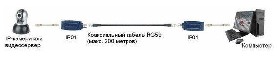 Пассивный удлинитель Ethernet IP01. В комплекте идет 2 приёмопередатчика. Позволяет передавать данные по коаксиальному кабелю на расстоянии до 200 метров (используется кабель RG-59). Полудуплексный режим передачи данных. Устройство служит для подключения IP-камер, IP-видеосерверов, видеорегистраторов.