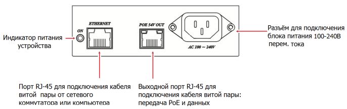 Инжектор: вход - RJ45/220В, выход - RJ45(PoE).