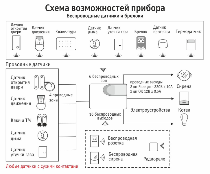 ИПРо 6 Беспроводной GSM Набор "Контроль аварийных ситуаций" предназначен для управления безопасностью и позонным управлением микроклиматом в помещении при помощи смартфона. Возможно подключение до 80 проводных и до 30 беспроводных датчиков (утечки газа, протечки воды, задымления,температуры, движения и т.д.). Оповещение об аварийных ситуациях и изменениях происходит в виде sms-сообщений и звонков на смартфон. Имеется два реле для управления электроприборами (220В/10А).