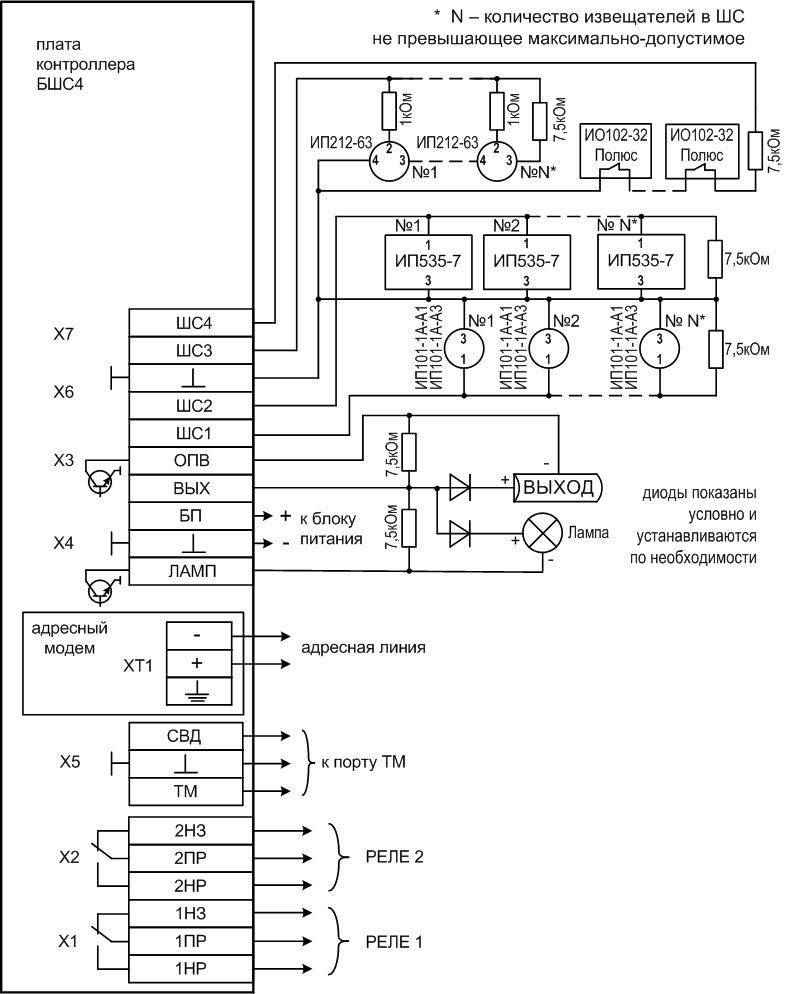 Прибор «КАРАТ» позволяет подключить до 57-ми блоков расширения «БШС4». Подключение блока к прибору осуществляется по 2-х проводной линии.