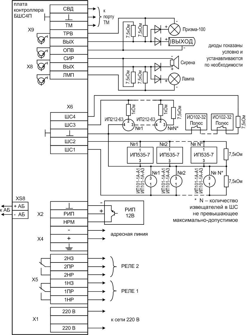Прибор КАРАТ позволяет подключить до 57-ми блоков расширения БШС4П. Подключение блока к прибору осуществляется по 2-х проводной линии.