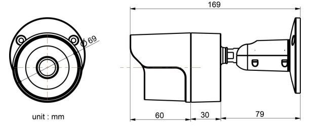 Габаритные размеры устройства Ø70 х 169 мм. Диапазон рабочих температур от -10 °C до +50 °C. Питание 12 В, PoE.