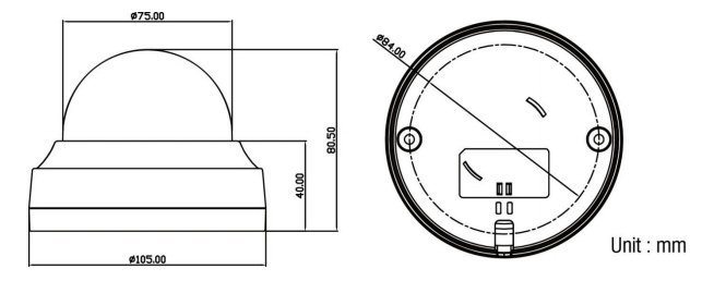 Габаритные размеры устройства Ø105 х 81 мм. Диапазон рабочих температур от -10 °C до +50 °C. Питание 12 В, PoE.