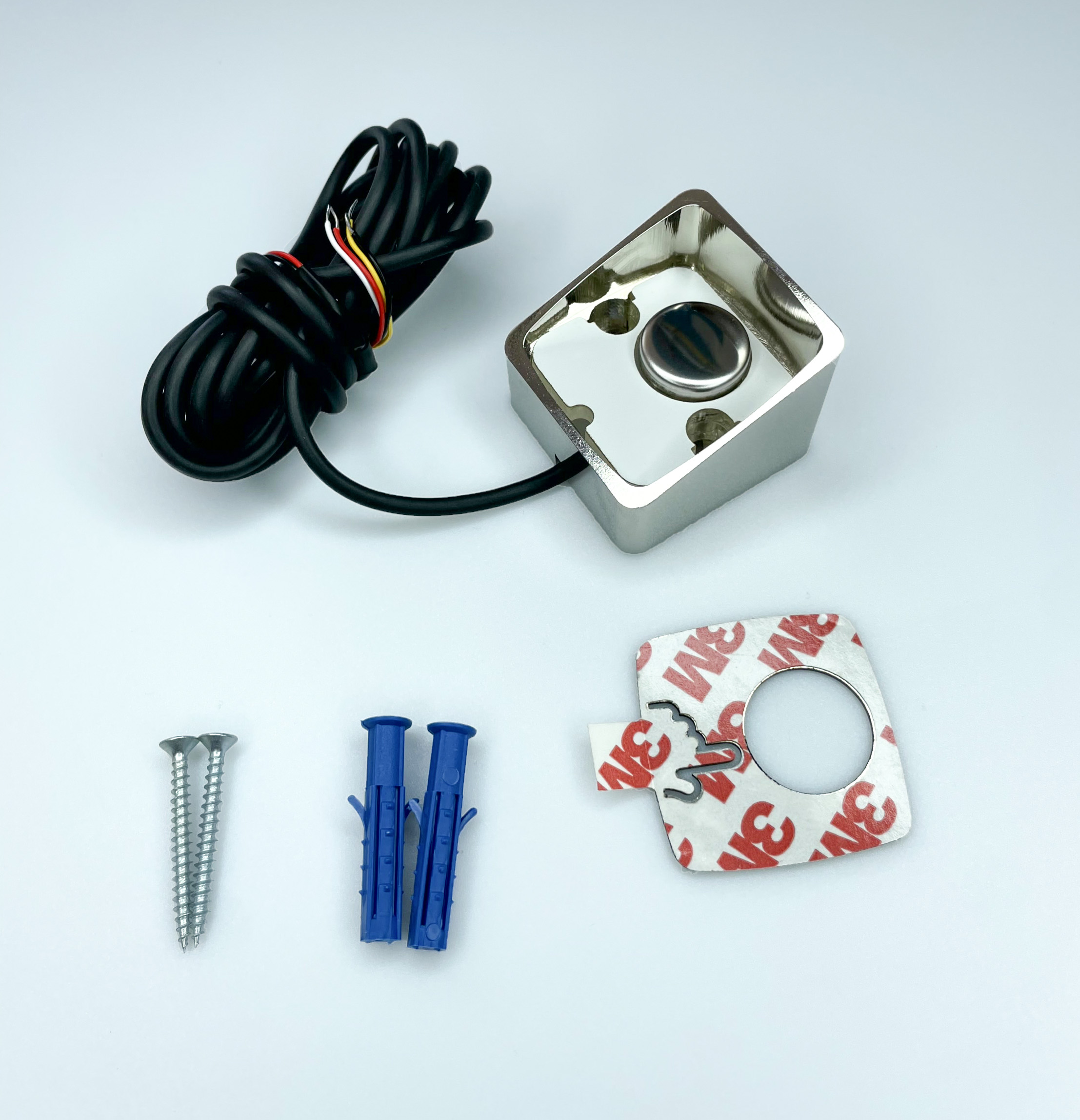 Кнопка накладная. Антивандальная механическая нормально разомкнутая кнопка. Подсветка контура и нажимной части белого цвета. Материал - нержавеющая сталь, алюминиевый сплав с анодированным покрытием. Нажимная часть из полированной нержавеющей стали . Контактная группа из бериллиевой бронзы покрытой серебром. Максимально коммутируемый ток 1А при максимальном напряжении 36В. Питание подсветки +12В при потреблении 10мА. Средняя наработка на отказ- более 1млн. коммутаций. Всепогодная, но не допускает постоянного нахождения под открытым сильным дождем.