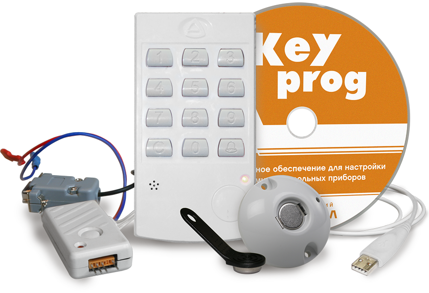 Комплект программирования для автономных приборов Циркон, Карат, Курс, Гранит-16/24, Гранит-24 с БИУ TFT. Состав комплекта: клавиатура Портал вар.1, ключ Touch Memory 1996, USB-кабель, USB-программатор, CD с ПО "KeyProg"