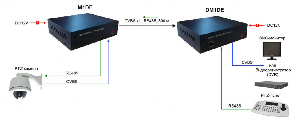 Удлинитель (1 канальный) композитного видеосигнала M1DE+DM1DE с RS-485 по одному коаксиальному кабелю (RG-59) до 800 метров. Позволяет добавить одну PTZ-камеру в систему видеонаблюдения с поддержкой функций (таких как зум, наклон, панорамирование). Комплект состоит из передатчика и приемника. Передатчик: Вх. - 1 BNC/Клм.DC12V(130mA)/Клм.(RS-485), Вых. - 1 BNC/Клм.DC12V(130mA), приемник: Вх. - 1 BNC/Клм.DC12V(100mA). Возможность обеспечить питанием дополнительные устройства 9-12В (приемник и передатчик). В комплекте 2 блока питания. Имеется защита от помех. Режим работы RS485: полудуплекс.
