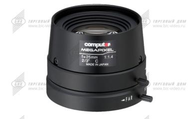 Формат 2/3". Предназначен для камер Full HD с разрешением 5 Мп. Фиксированное фокусное расстояние 25 мм. Ручное управление диафрагмой. Диапазон изменения диафрагмы F1.4-16C. Минимальное расстояние фокусировки 1,5 метра. Тип крепления объектива C. Пиковая производительность на большом расстоянии.