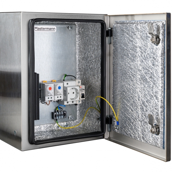 МАСТЕР-2УТП-Н Климатический навесной шкаф из нержавеющей стали предназначен для использования в любых климатических условиях на улице (-55°С +50°С). С защитным реле от "холодного пуска", IP 66. Вес: 5 кг. Нерж. сталь сатинированная AISI304.