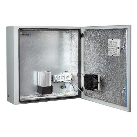 Термошкаф оснащен системой автоматического поддержания заданной температуры и относительной влажности, обеспечивающей безопасную работу размещенного в нём оборудования при температуре окружающего воздуха от -55°С до +50°С со степенью защиты IP54.