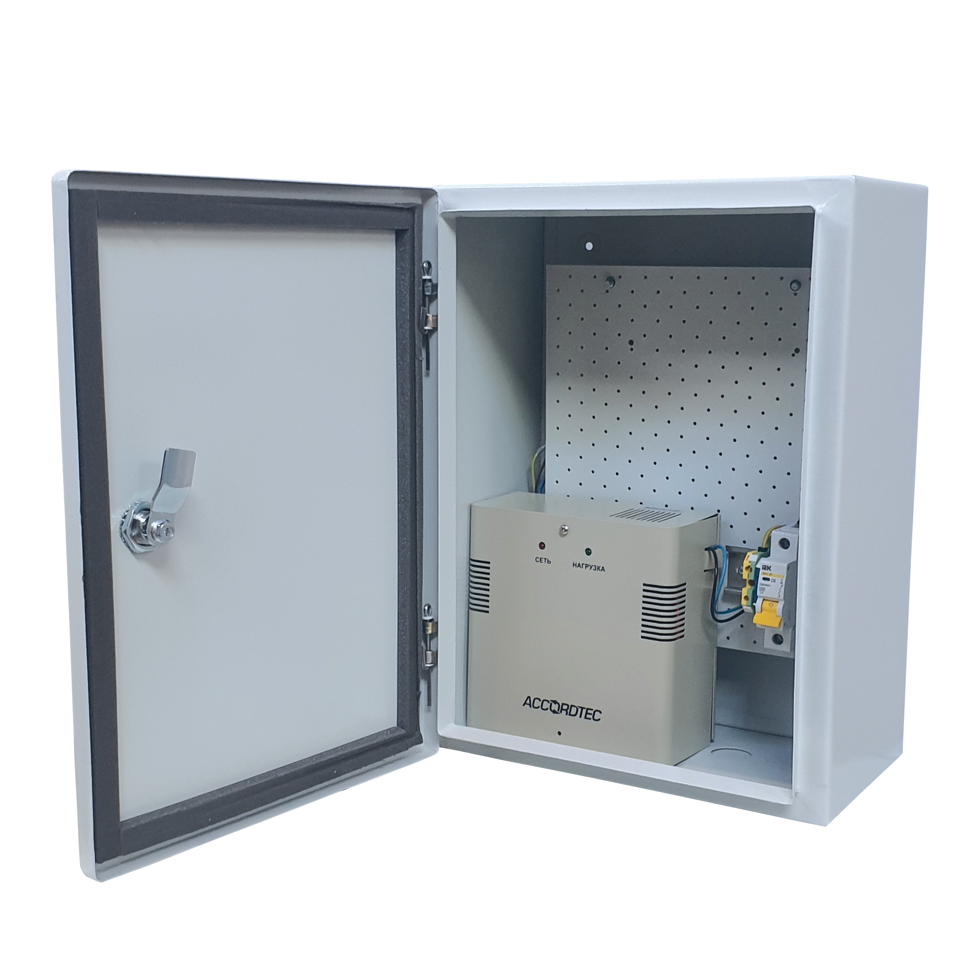 Комплектация: замок 1 шт,ключ 1 шт, монтажная плата 1шт, гермовводы 2шт, автоматический выключатель 6А 1шт,AccordTec ББП-40 - 1шт.
