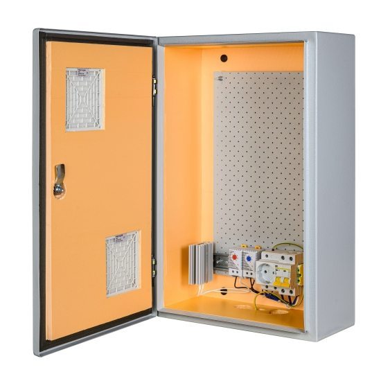 Термошкаф оснащен системой автоматического поддержания заданной температуры и относительной влажности, обеспечивающей безопасную работу размещенного в нём оборудования при температуре окружающего воздуха от -55°С до +50°С со степенью защиты IP54.
