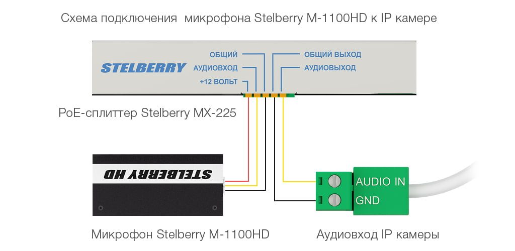 Для записи разговоров, микрофон можно подключить к аудиорегистратору или к любой IP камере, имеющей аудиовход.