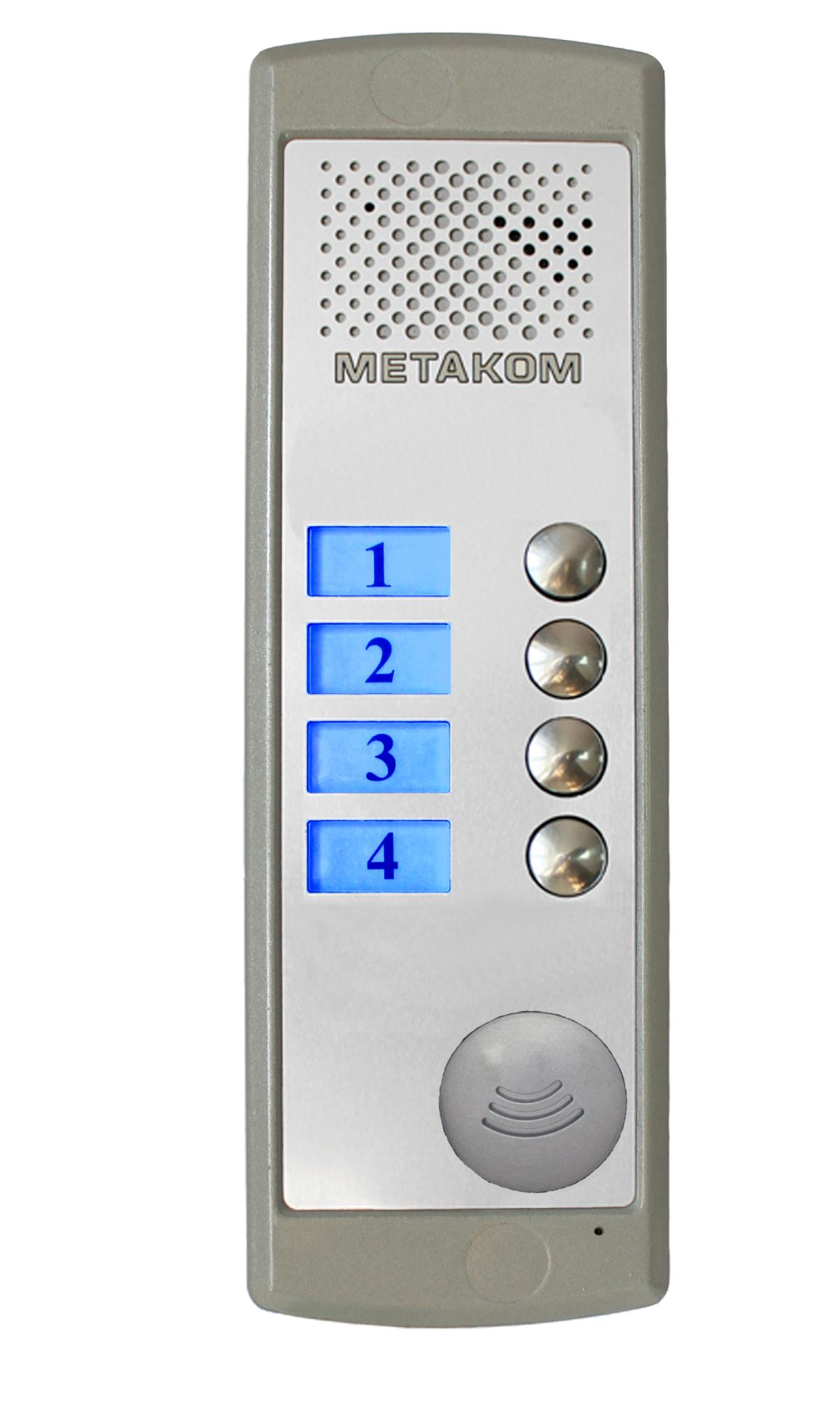 Четырёхабонентный блок вызова с координатной системой адресации со встроенной видеокамерой. Оборудован встроенным контроллером и считывателем бесконтактных ключей MF136P (частота 13,56 мГц). Тип корпуса: накладной.