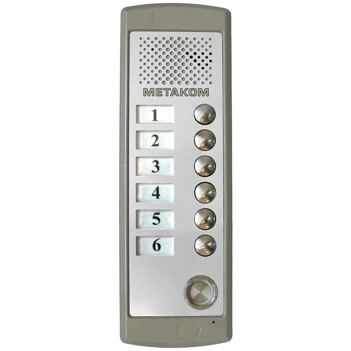 Шестиабонентный блок вызова домофона MK6-K-TMV с координатной системой адресации предназначен для обеспечения звуковой связи конкретного абонента с посетителем и дистанционного открывания замка. Устанавливается в многоквартирных домах, офисах. Устройство оснащено цветной видеокамерой и инфракрасной подсветкой, которая позволяет получать изображение на видеомониторе (при расстоянии до наблюдаемого объекта не более 1м) даже при полном отсутствии освещения. Световая и звуковая индикация, подсветка номера абонента. Блок оборудован контроллером и контактным считывателем для ключей TM2003 или DS1990А. Также можно приобрести модели MK6-K-RFV и MK6-K-MFV, которые работают с бесконтактными брелоками proximity. Накладной монтаж.