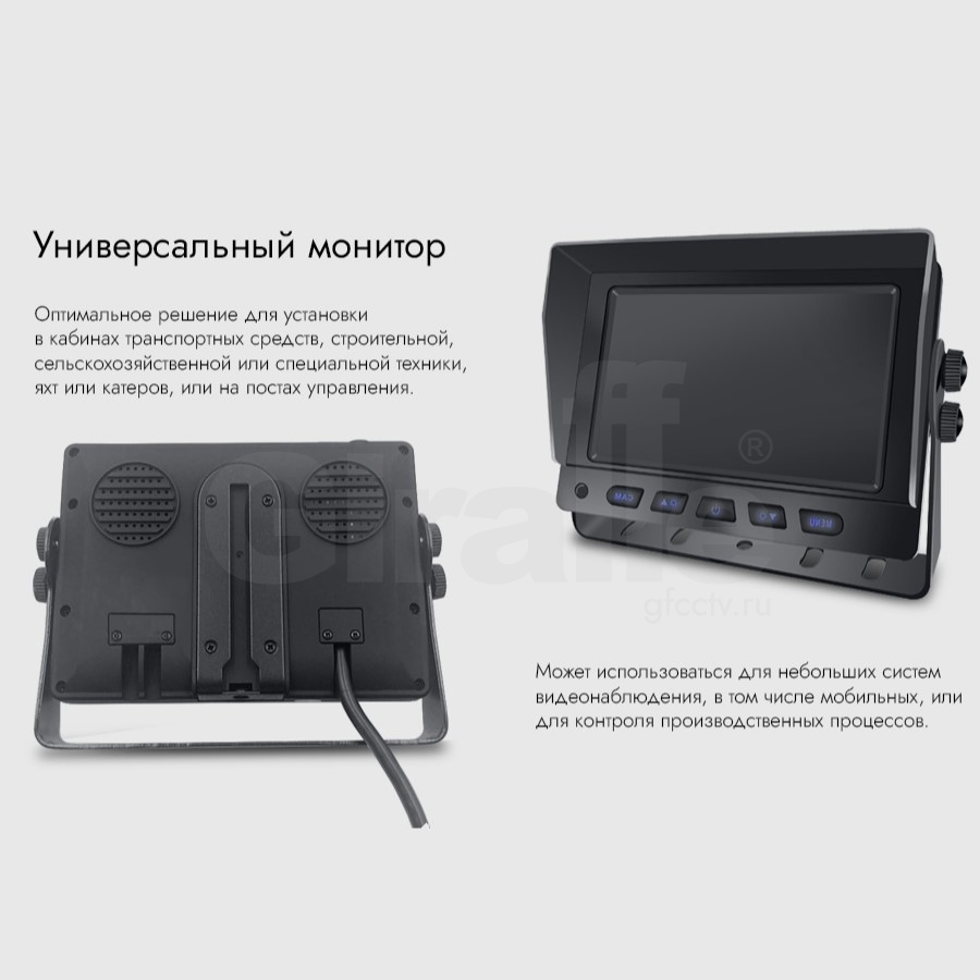 Монитор двухканальный GF-AM050 v2 предназначен для отображения на экране телевизионного изображения, поступающего на его входы от различных источников (видеокамеры, видеорегистраторы, и т.п.).