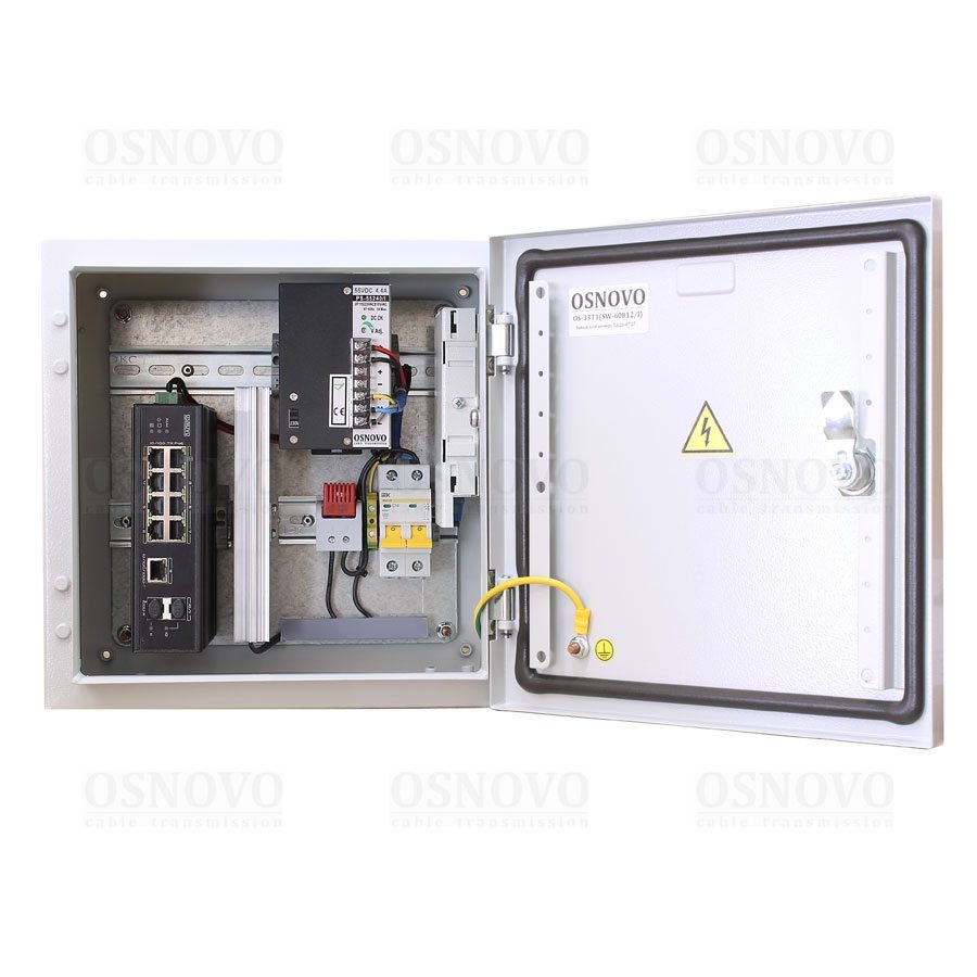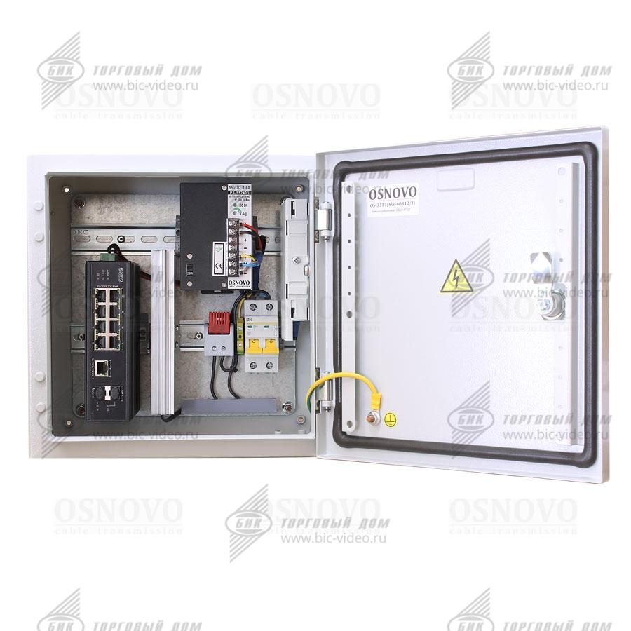 Уличный коммутатор с термостабилизацией на базе уличной станции OSNOVO OS-33T1. Порты: 6 x FE (10/100Base-T) с PoE (до 30W) + 2 x FE (10/100Base-T) с PoE (до 60W) + 1 x GE (10/100/1000Base-T) + 2 x GE SFP (1000Base-X). Суммарный бюджет PoE до 240W. Режим антизависания и режим удлинения линий связи по 8-ми PoE портам до 250м (скорость до 10Мбит/с). Металлический шкаф (ШxВxГ): 300х300х210мм, питание AC195-265V, оптический кросс. Рабочая температура (температура окружающей среды): -50…+50°С, температура внутри станции -15…+55°С, исполнение IP66.