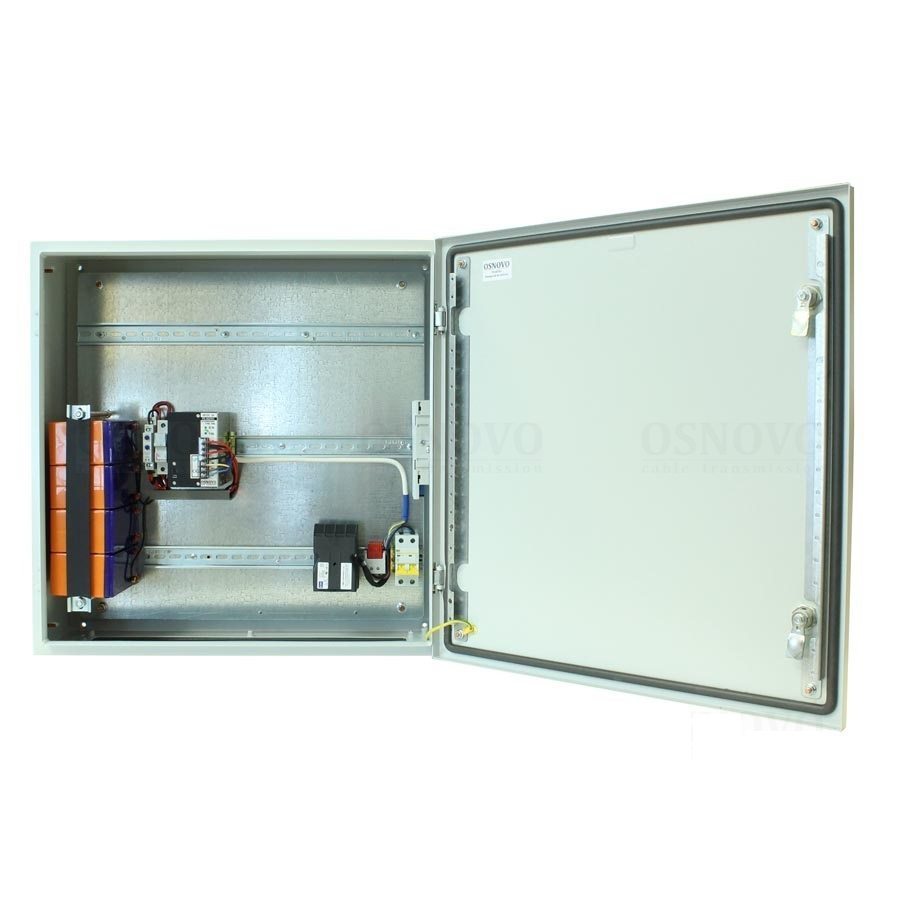 В основе данной станции металлический шкаф со степенью защиты IP66. Доступное место под установку оборудования на встроенные DIN-рейки: верхняя - 540мм, средняя - 240мм, нижняя - 300мм. Промышленный БП DC48V(240W), АКБ 48В(7Ач). Защита АКБ от глубокого разряда.