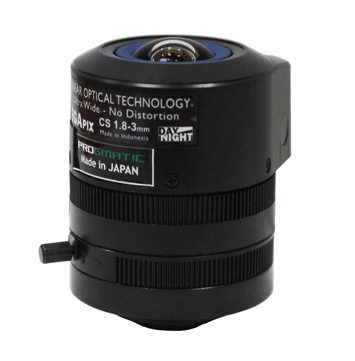 Изменяемое фокусное расстояние f 1.8-3,0 мм с форматом матрицы 1/2,5'', тип крепления - CS. Горизонтальный угол обзора - 115-88.