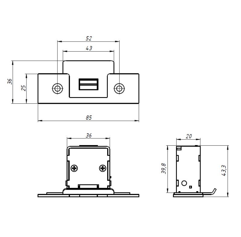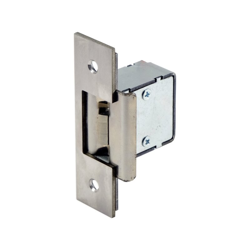 Электромеханическая защёлка с силой удержания: 400 кг, нормально открытая; в комплект поставки входит короткая лицевая планка, напряжение питания 12В, потребляемый ток 0,15 А, 25(36)х85х43,3 мм.