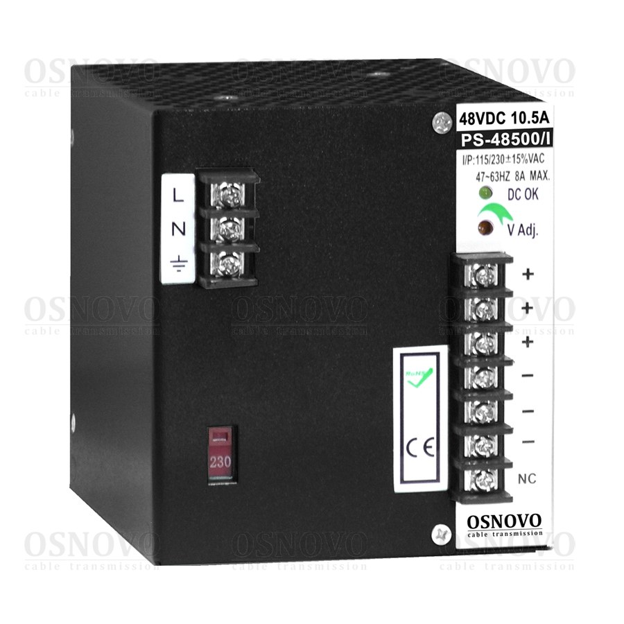 Промышленный блок питания. DC48V, 10,5A (500W). Диапазон входных напряжений: AC195-265V. КПД: 85%. Регулировка выходного напряжения в диапазоне 44-53V. Защита от короткого замыкания, перенапряжения и перегрузки. Принудительная система охлаждения (вентилятор). Монтаж на DIN-рейку или стену. Размеры (ШxВxГ): 100x110x121мм. Рабочая температура: -40...+50°C.