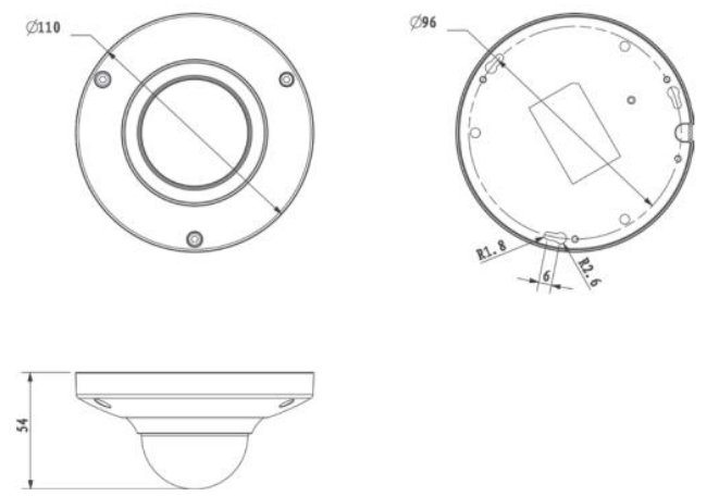 Габаритные размеры устройства Ø110 x 54 мм. Диапазон рабочей температуры от -10° до +50° С. Питание 12 В, поддерживает PoE.