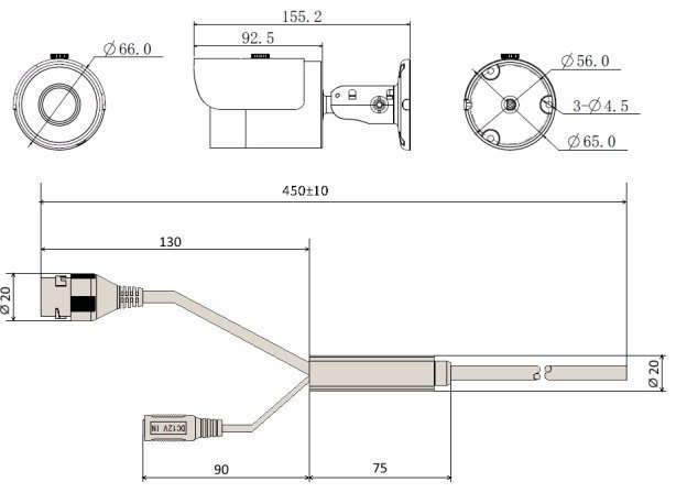 Габаритные размеры устройства Ø64 x160 мм. Диапазон рабочей температуры от -40° до +50° С. Питание 12 В, поддерживает PoE.
