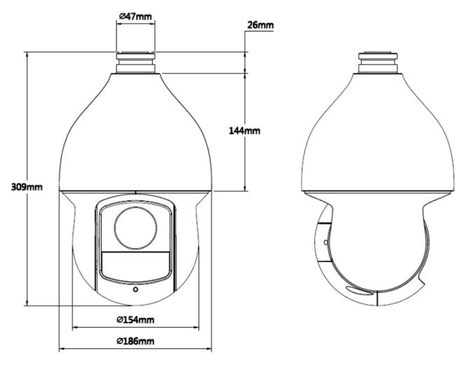 Габаритные размеры устройства Ø186 х 309 мм. Диапазон рабочих температур от -40° до +70° С. Питание 24 В, поддерживает PoE.
