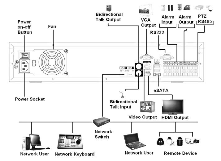Видеовыходы: 1 x HDMI, 1 x VGA, 1 х BNC. Поддержка 2-х USB портов. 1 аудиовход (BNC)/1 аудиовыход (BNC). 16 тревожных входов, 6 тревожных выхода. Все события записываются в журнал с помощью функции Syslog. Алгоритм сжатия видео - H.264. Интерфейс RS485 поддерживает PTZ управление, а RS232 интерфейс - клавиатуру и ПК. Управление с помощью мобильных устройств на базе iОS/Blackberry/Android/Windows Mobile/Symbian. Устройство может работать совместно с такими камерами, как RVi, Arecont Vision, Canon, Axis Communications, Dynacolor, Beward (BD-серии), Panasonic, Hikvision, SAMSUNG, SONY, SANYO, Onvif. Встроенный web-сервер. В комплект входит CD с ПО RVi-SmartPSS.