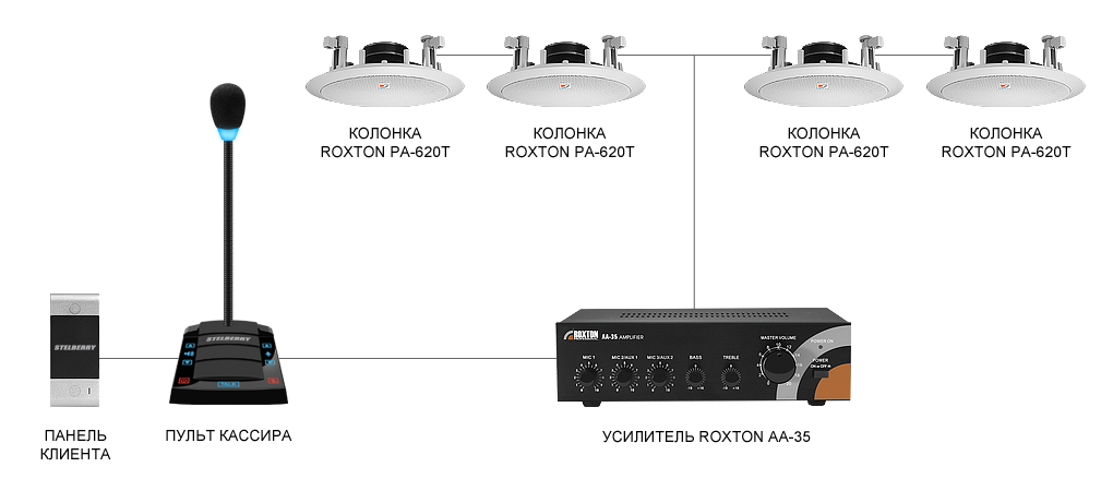 Устройство Stelberry S-500 предназначено для установки в метрополитене, банках, АЗС и других учреждениях, где востребовано оповещение для клиентов. При необходимости возможно организовать систему громкой связи, применив усилитель и дополнительные динамики.