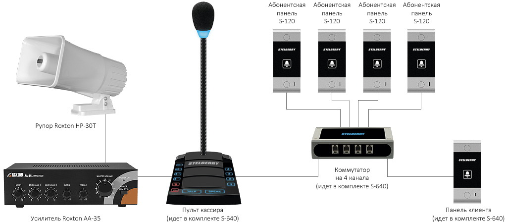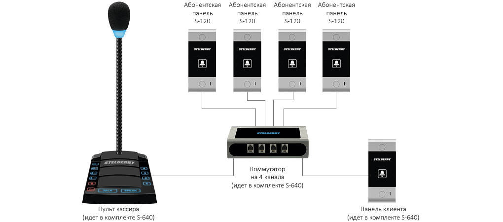 Устройство простое в использовании, успешно сочетает в себе инновационный дизайн, высокое качество звука, богатый набор функций и низкую стоимость. Все эти особенности качественно отличают устройство STELBERRY S-640 от его аналогов. Корпус панели изготовлен из высокопрочного алюминиевого сплава, что обеспечивает ей хорошую вандалозащищенность. Микрофон обладает высокой чувствительностью, обеспечивающей хорошее качество звука, даже если оператор находится на расстоянии от устройства. На пульте имеется кнопка отключения микрофона кассира, регулировка громкости и чувствительности микрофона.