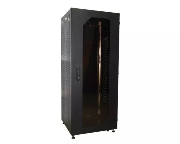 Шкаф телекоммуникационный 19" напольный 72U чёрный на 13 приборов ТШ-476060Ч13 (RAL 9005, 600x600, полезная глубина 506мм, дверь стекло, в комплекте вентиляторный блок с проводом и вилкой 220В, термостат, кронштейн, два блока розеток на 8 гнезд, 13 полок, 13 фальш панелей, ролики, метизы, провода заземления)