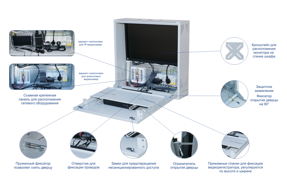 Шкаф для видеорегистратора предназначен для настенного размещения компонентов системы видеонаблюдения: монитора, видеорегистратора, блока питания, а также другого сетевого и электронного оборудования. Может использоваться в офисах,магазинах, АЗС, складах, школах, детских садах, медицинских учреждениях, дачах, коттеджах, загородных домах и т.д.