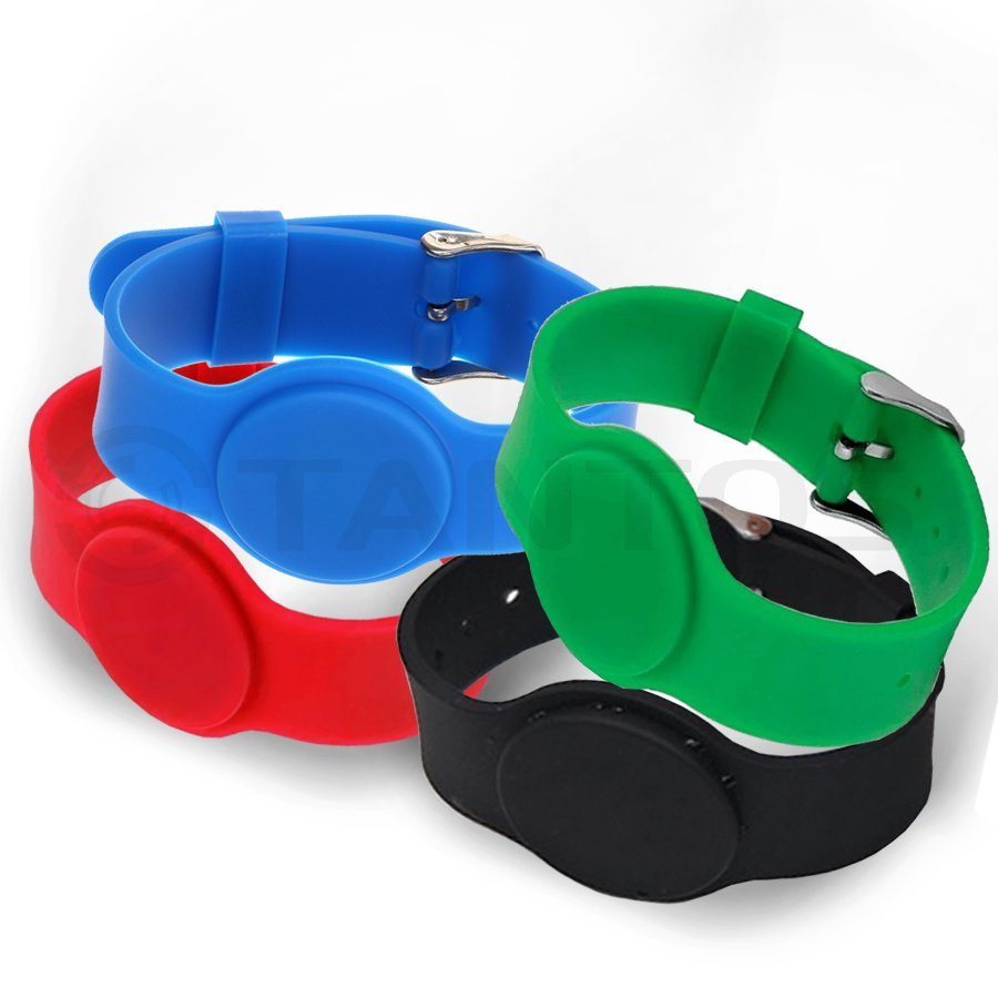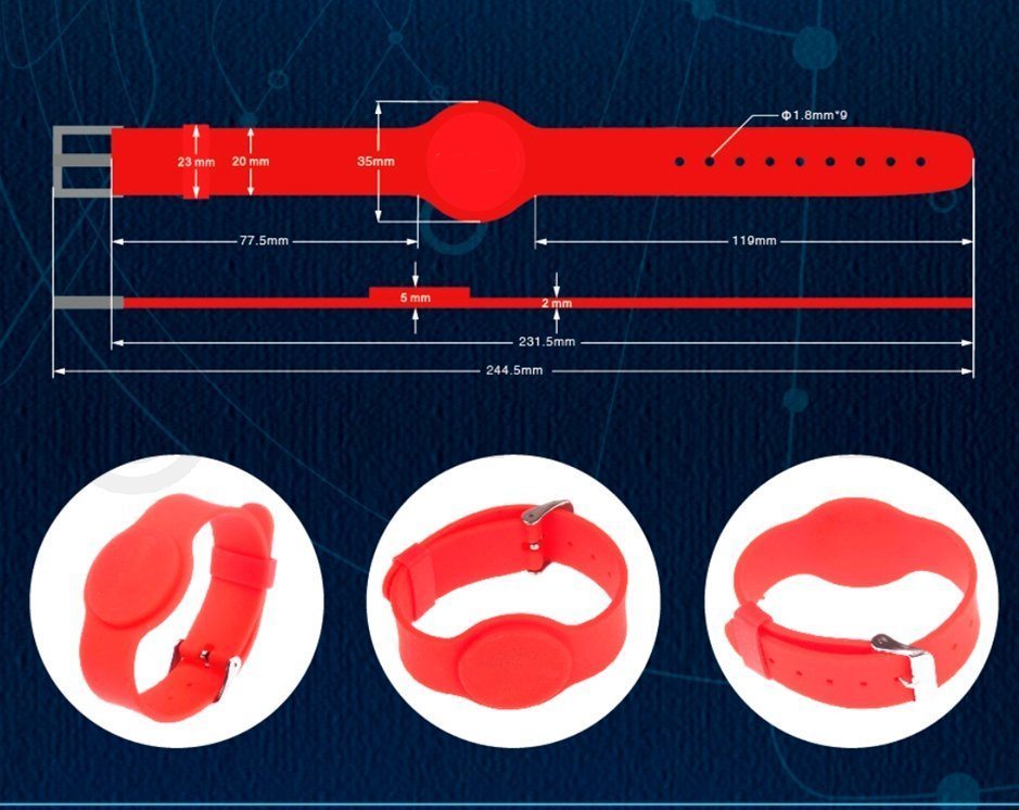 Браслет с рабочей частотой 13,56 МГц водонепроницаемый, с застежкой, материал - силикон, длина (с учётом застежки) - 23,5 см, ширина ремешка - 2 см (3,5 см в самой широкой части),